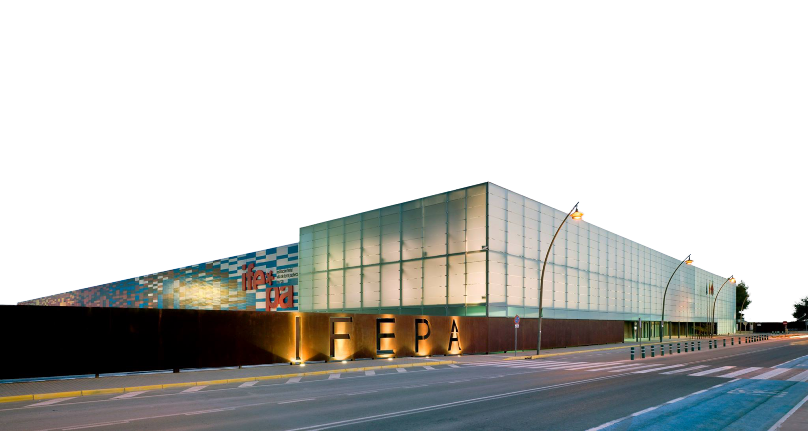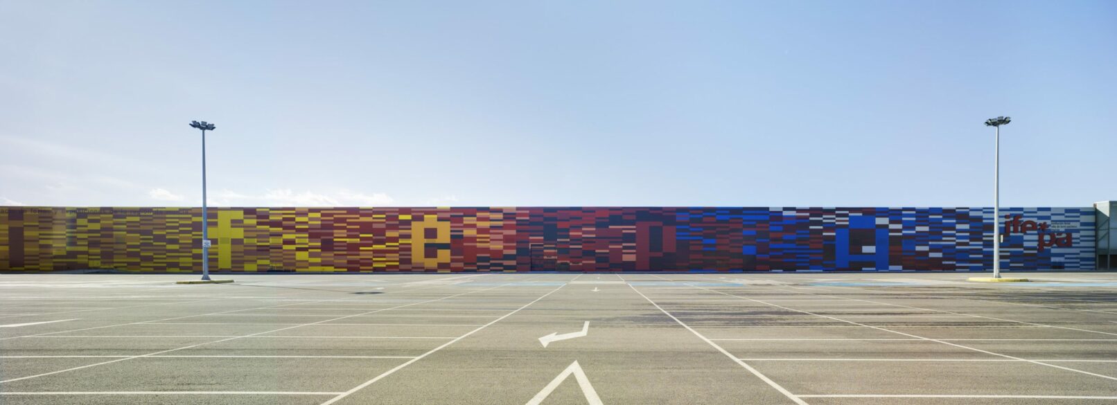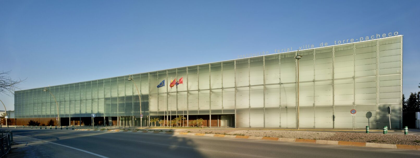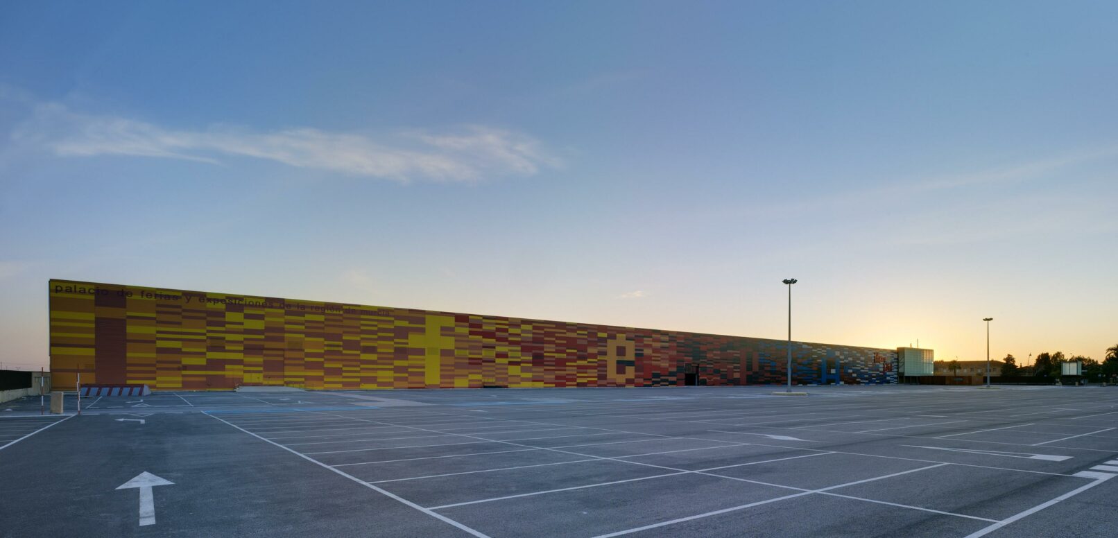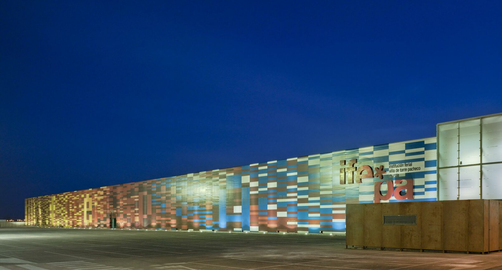 Esta singular fachada supone una superficie vertical de más de 2400 m2. la cual se puede apreciar desde varios puntos en la lejanía de Torre Pacheco, está constituida por 9 colores sólidos que se entreunen entre si y forman la palabra de la institución sólo visible en la lejania y que de alguna forma dialogan con el visitante.