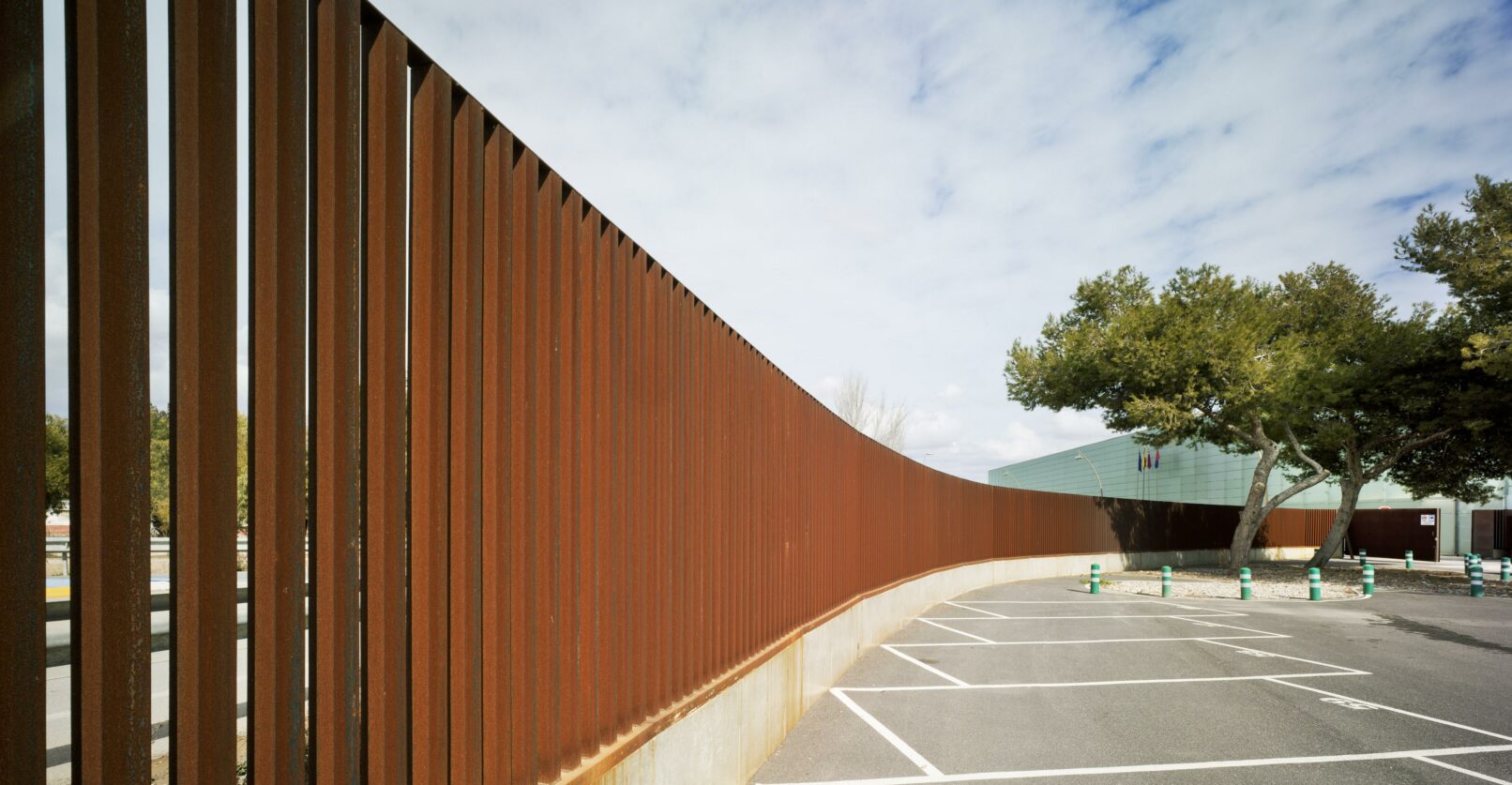 Para los aparcamientos y accesos al recinto se empleó nuevamente el acero corten en todo su perímetro, marcando los distintos aparcamientos con casetas de acceso-faros que muestran al visitante una cálida bienvenida.